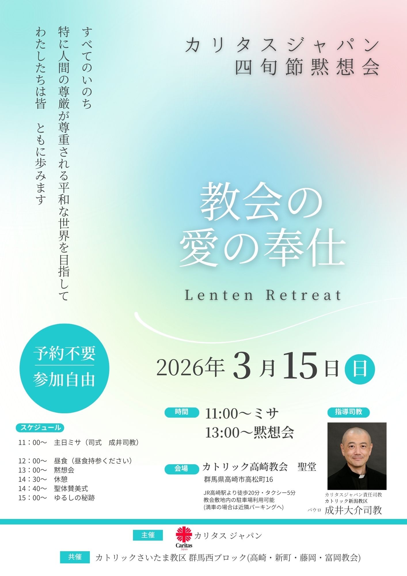 3月15日(日)にカリタスジャパン主催による黙想会が予定されています。