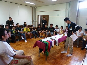 チーム別の帽子作り、グループは年齢も縦割りで。 赤:マリアチーム 緑:アポロチーム 黄:ヤコブチーム 紫:ヨセフチーム |