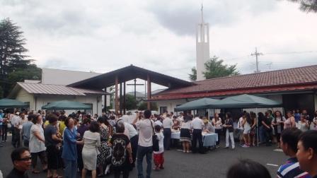 司牧訪問のこの日約300名の人たちが思いを一つにし、豊かな典礼の国際ミサをささげた。 毎週の教会の「お知らせ」は、七ヶ国語に翻訳して設置。 |