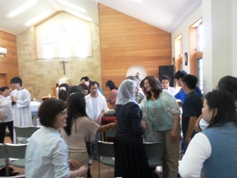 受洗者一名、受堅者一名のお祝いのために約150人が集まりともに祈った。