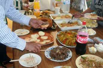 料理は、ペルーの方々から持ちよりの郷土料理をはじめ、日本人からは焼きそば、プルコギを振る舞い、楽しい交流の一時となった。(肥喜里記) |